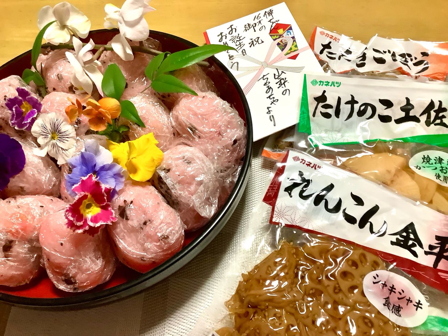 箱の中に、お祝いと、コーンスープや.たけのこ、ごぼう、ハスの煮物も、入れて送ってあげました、庭先に咲いている♪パンジーの花♪や、「南天の葉」を、添えて写真を撮りました、お祝いの袋の裏には→書き切れないほどの.沢山のメッセージを書いてあげました。、ご覧になってください。