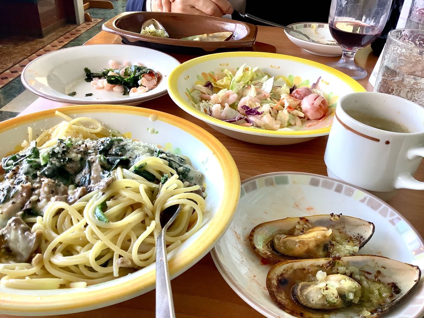 ほうれん草のパスタや、ムール貝、海老サラダ、ハンバーグ→ライス、等を、食べた後→ドリア2個と.イタリアのワインを.お土産に.買ってきました、