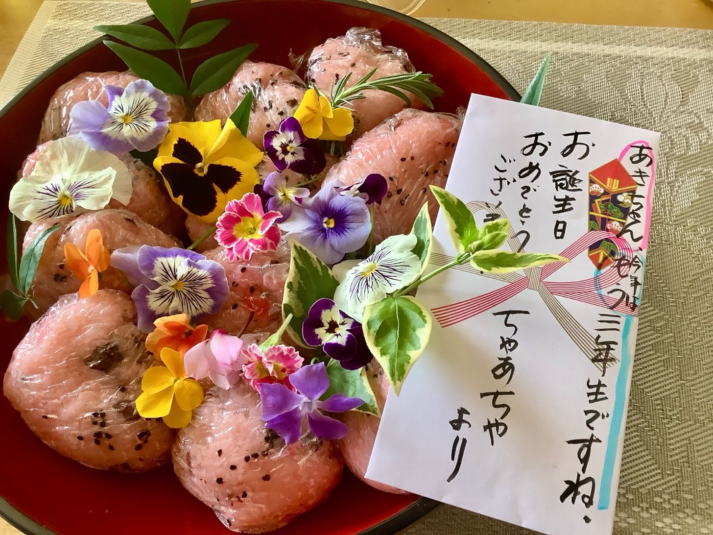 昨日→餅米を、韮崎市の→お友達.内藤誠子さんから、5K.分けて.もらいました、まもなく.10日には、パパの誕生日が、近づいています。早速→昨日のうちに、準備をして、今朝、早く→赤飯を炊いて、、神様や、、お仏壇に、お供えしました、孫は、、朝、起きて..ちゃあちゃん..お誕生日!の、お祝いと、お赤飯☆ありがとう☆と、言って、早速お赤飯を、食べていました、お祝いの封筒の裏には、メッセージを、書き切れないほど、いっぱい:書いてあげました。