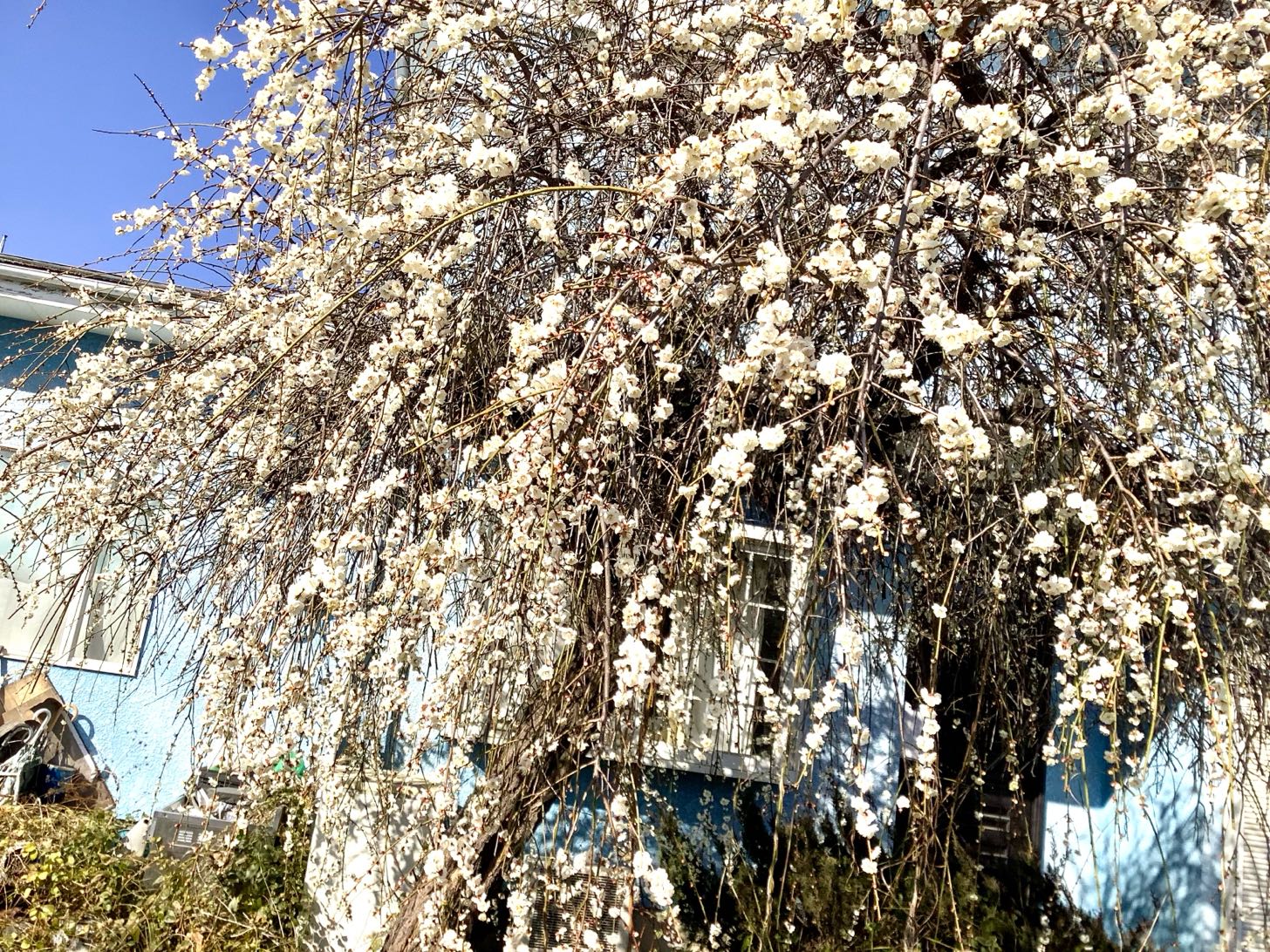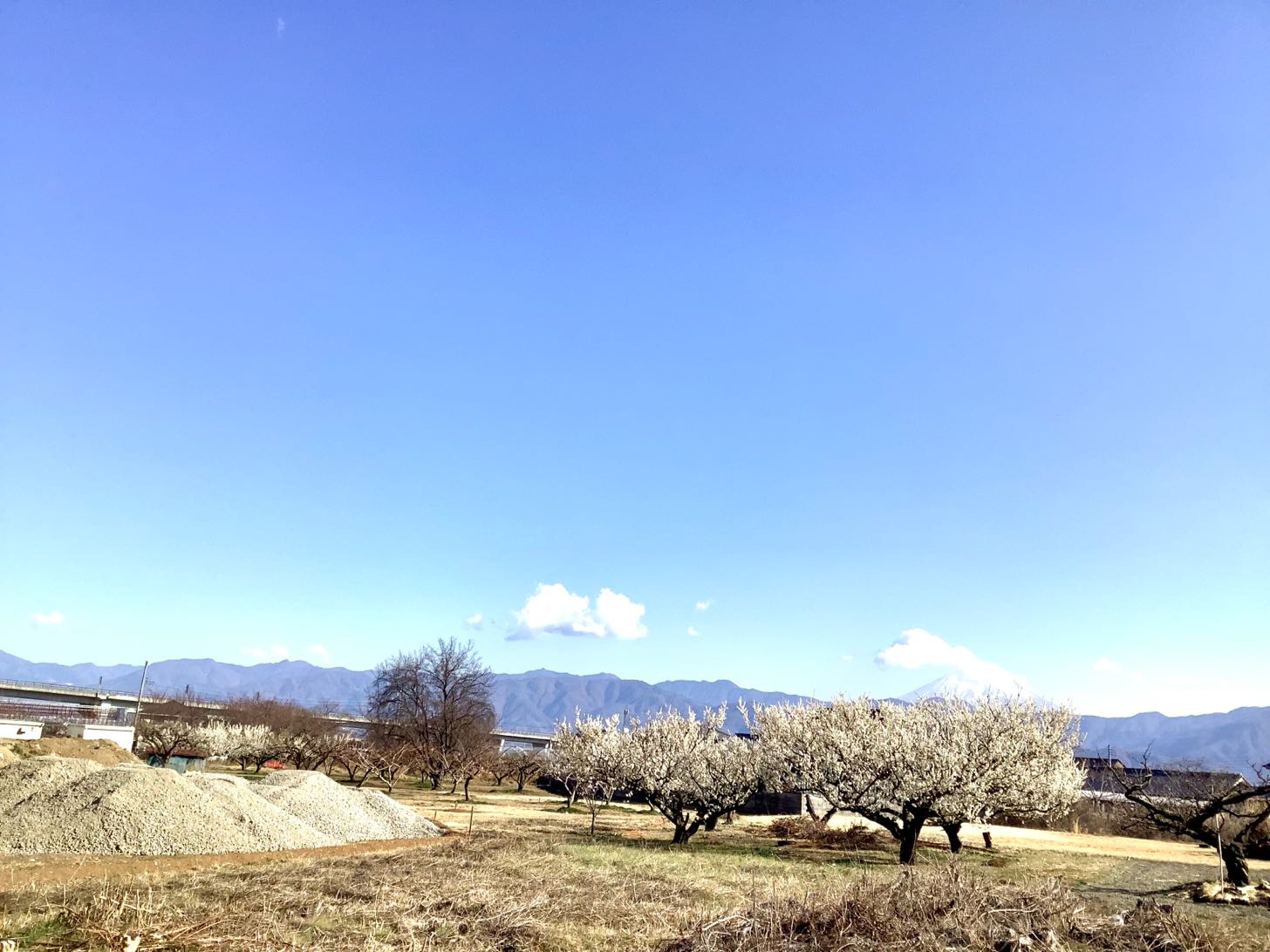 会長ブログ梅の花が満開に→☆☆きれいに咲いています.24日.南アルプス市に、綺麗な♪「梅の花」が.今→♪満開に♪咲いています。♪梅の花の→遠くに見える、白い雲の下には→富士山が見えます。、写真の.左側の高い所には.→静岡県から、山梨県→長野県に向けて→「中部自動車横断道」が.走っています。しだれ梅は→近くの家の→庭に咲いている、→→「大きな.しだれ梅」が満開です。ご覧になってください。  2026年2月24日.撮影.東條初恵.