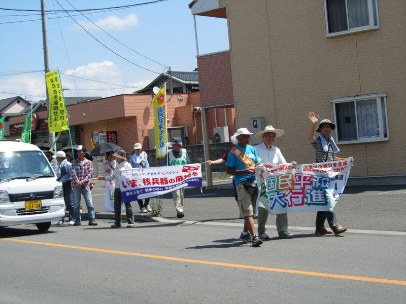 14日、午前、シラネパックの会社の前を通過した、賑やかな国民平和、大行進です。過去におきた、広島、長崎の、核兵器の廃絶、戦争のない平和な世界をつくろうと、元、共産党から出た、県議会議員の、中岡晴江さんも、一緒になって、行進に参加していました。御苦労さまでした。7月15日 撮影 東條初恵
