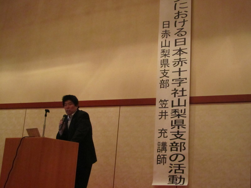 25日、夜7時30分より、桃源閣で、赤十字奉仕団、白根分団の全体会議で、山梨支部の笠井充さんが、新しい奉仕団員に、「赤十字って何、、???」1)民間の団体で、、ボランティアの団体である事。 2)世界的な組織、、財源を支えているのは国民です。3)人の命と尊厳を守ることを目的とした団体です。と、お話されました。5月26日 撮影 東條初恵