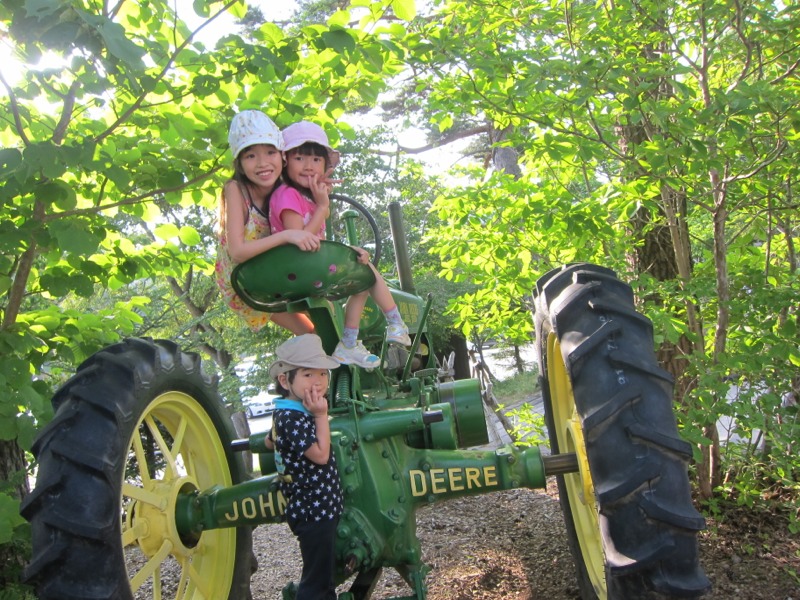 トラクターと、緑の木々と、孫3人のポーズを、ご覧になって下さい。