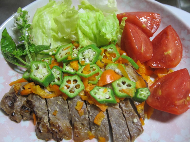 我が家の、今朝、採ったばかりの野菜たちが、勢揃いして、お肉を、盛り上げています。
