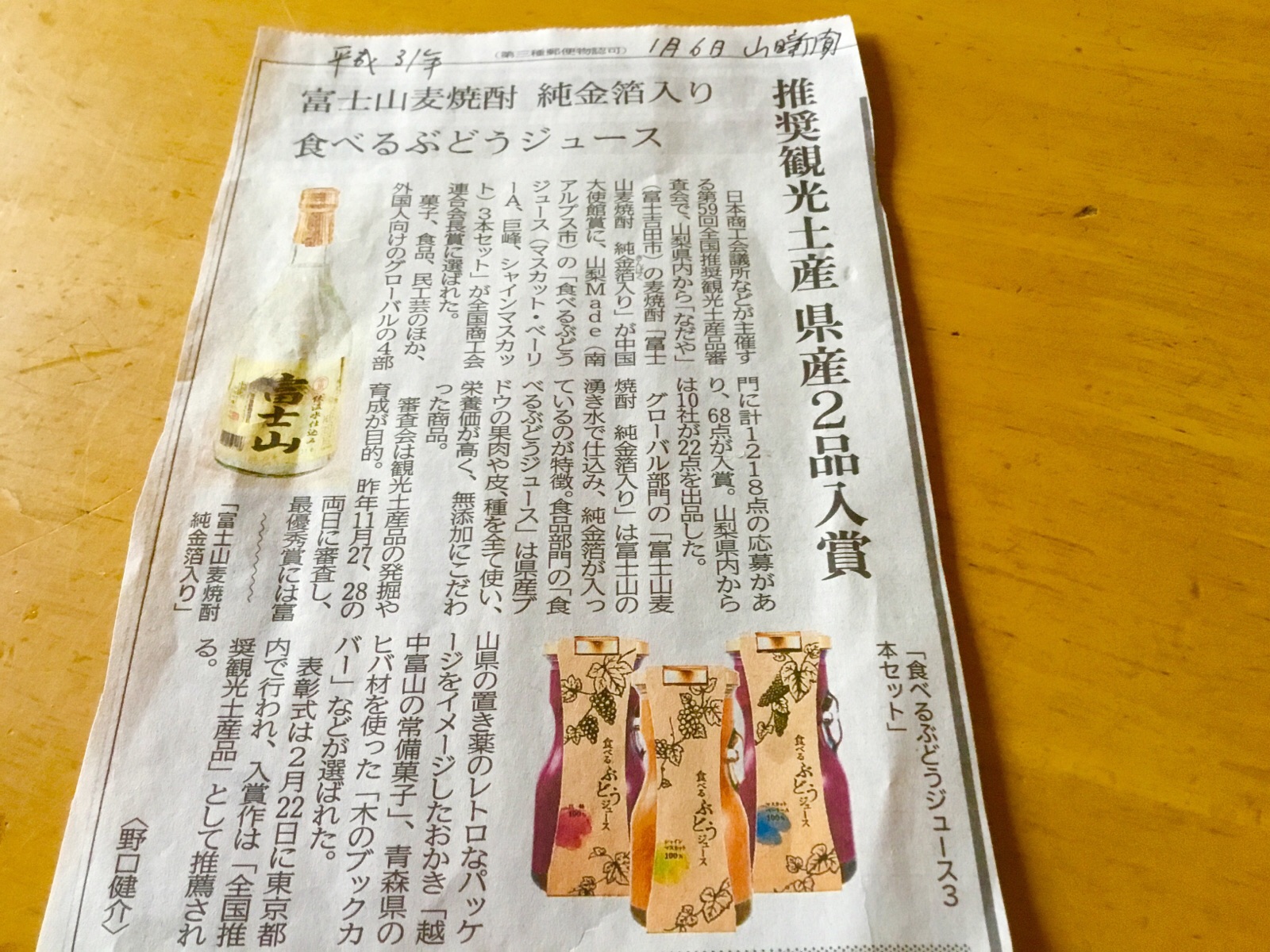 今朝の→サンニチ新聞に、日本商工会議所などが主催する、第59回全国推奨観光土産品審査会で、観光土産「推奨品」として、県内からは、ジットのまるごと「食べるぶどうジュース」3本セットと、富士山麦焼酎、純金箔入りの2品が、選ばれました。ご覧になって下さい。平成31年1月6日、撮影 東條初恵