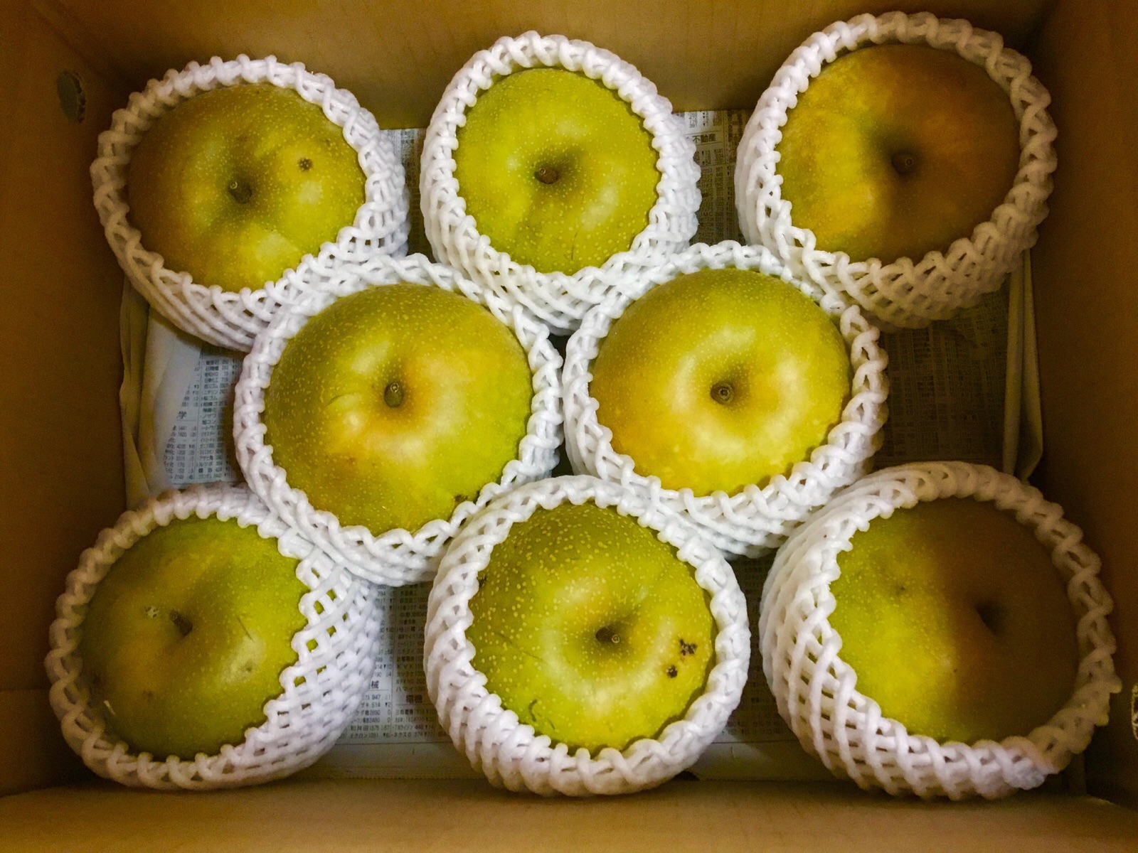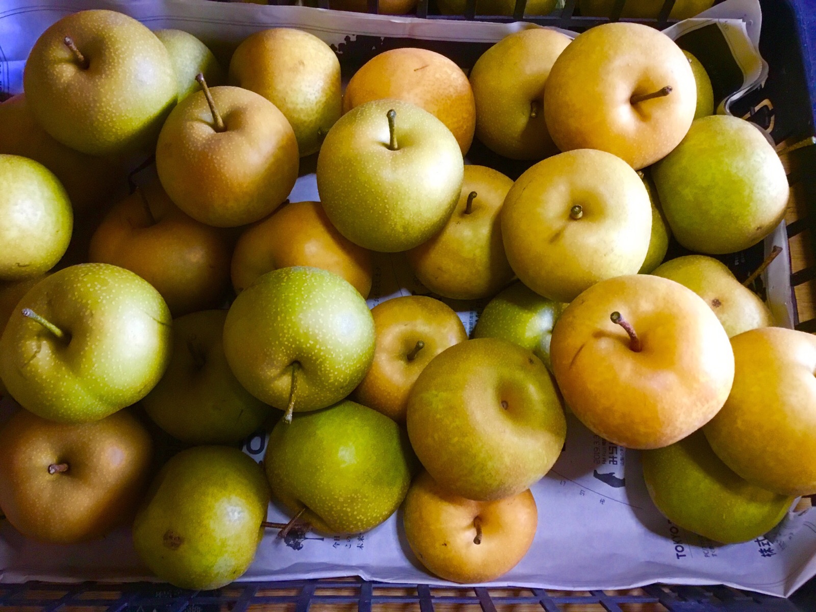 19日.今年初めて→一邦さんが、梨(幸水)を畑から.収穫してきましたが、カラスも、この暑さに、水不足で→梨をクチバシで、突いて黒くポチポチが出ていますか、暑かったので甘味は増して、とっても美味しくいただいています。写真の何倍もの梨を取ってきて→コンテナへ6個、、家の中は、梨でいっぱいです、今日、県外の人に、箱に詰めて7個、送りましたご覧になって下さい。平成30年8月19日、撮影 東條初恵