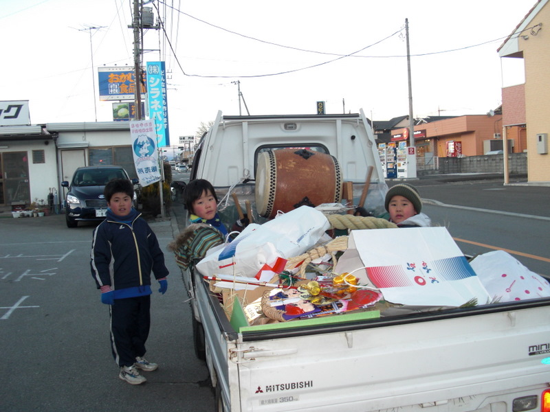 14日、4時ころ、地域の子供たちが、太鼓をたたきながら、お正月飾りの回収にやってきました、軽トラックの後を、さい銭箱をもって歩いて回る子供たちもいます。さい銭箱の中を見たら1000円札がいっぱい入っていました。沢山の収穫で良かったネ。1月14日 撮影 東條初恵