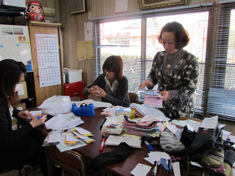 24日、午後1時30分から4時迄かかって、やまなし女性異業種の会の会員から集められた、下着の仕分け作業は、子供用は、女児、男児、女性用のM~LLまで、男性用M~LL迄、靴下何センチ、雨カッパ、女性用ナプキン、衛生用品、おむつ等を、細かく、現地に行っても、迷子にならない様に、名札を付けてキチンと、仕分けしました。3月25日 撮影 東條初恵