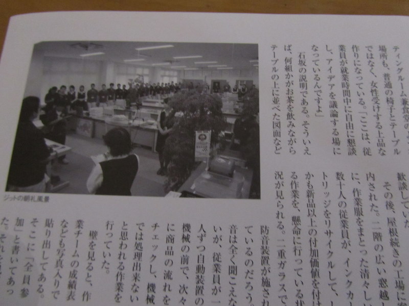 ジット、〔株〕、のスタートは、清々しく厳しく、全員参加で朝の朝礼から始まります。朝8時、大きな会議室に一斉に、一人ひとりのお顔が見えるさ様に、しっかり整列して並び、石坂正人社長の挨拶から始まります。朝礼見学は予め予約すると見学できると思います。私は、やまなし女性異業種の会の会員と、みんなで見学させていただき、とっても良い、勉強になりました。3月2日「撮影は財界の冊子より」 東條初恵