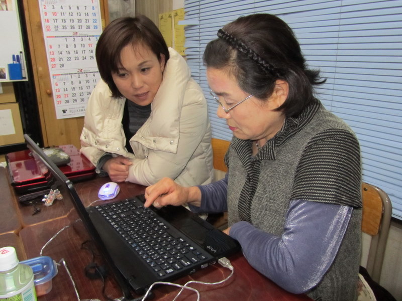 17日、夜、大型の一斉停電を、気にしながらのパソコン教室です、アレレ、、つい、さっきまで、生徒さんだった雨宮知帆子さんが、もう先生になって、内藤初三さんに教えています。雨宮さんは、覚えが早いですね。すごい。内藤さんも、喜んで教えてもらっていますね。仲間っていいですね。3月17日 撮影 東條初恵