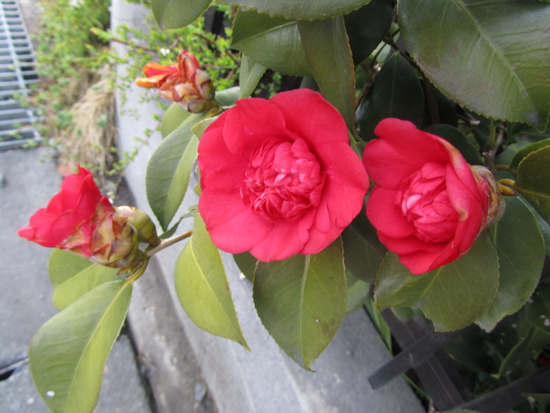 2日、わが家の庭先に、5~6年前に、大島から買って来たと言って、ツバキの苗木をお土産に、「美容室、マルセ」の石川キンコさんからいただきました。こんなに大きくなり、綺麗な花を咲かせました。八重ツバキです。「大島のツバキ」が、家の庭で、見られて幸せです。4月2日 撮影 東條初恵