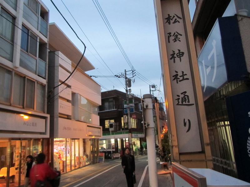 8日、午後6時すぎの、松陰神社通りの街の様子です。この近辺は両側に、昔の、お肉さん、魚屋さん、八百屋さん、パン屋さん、ケーキ屋さん、雑貨屋さん、薬屋さん、洋服屋さん、食堂、巻き寿司屋さん、お花屋さん、床屋さん、囲碁屋さん、が、軒並み並んで商売をシテイマス、山梨県でも、昔は何処の町も、みんな松陰神社通りの様に、様々なお店で賑わっていましたが、今では、県内に大型スーパーの続出で、この様な街並みは、珍しくなりました。今日、私は、世田谷にある、上馬整形外科の別府教授の、診察に行った帰りに、松陰神社へ寄って来ました。4月8日 撮影 東條初恵