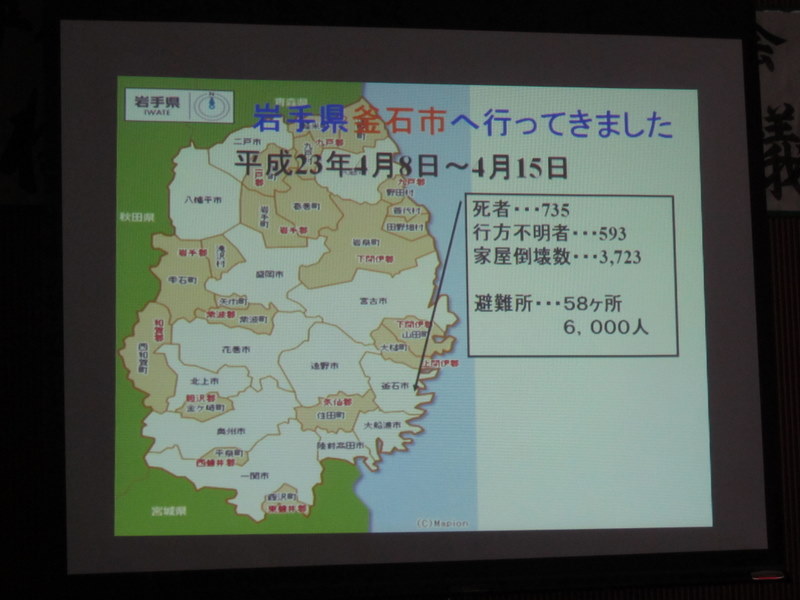 7日、午後1時30分より、南アルプス市健康福祉センターに於いて、しらね女連協の総会が行われました。総会の後の記念公園に、南アルプス市社会福祉協議会、防災担当の小林陽一様に、東日本東北関東大地震の、現場へ奉仕団として、4月8日~15日迄 出向いて来た話を元に、パネルを使ってお話をして下さいました。実際現場を見てきて、もし、南アルプス市に、大きな地震が来たら、一番身近で出来ること等の指導をしていただきました。写真は岩手県釜石市の状況です。5月7日 撮影 東條初恵