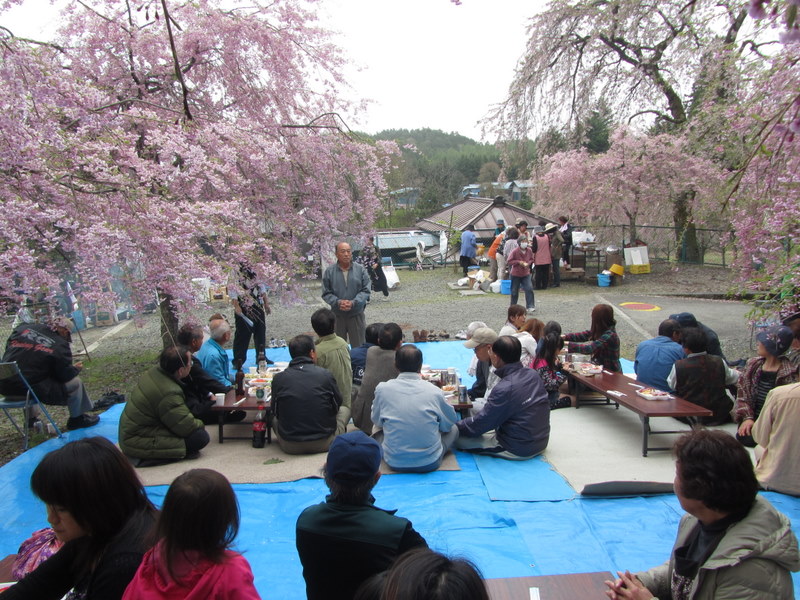 3日、南アルプス市高尾、穂見神社の「しだれ桜」は、今、満開でした。飯野11区の人達は、午前10時に公会堂に集まって、大型バス1台に乗って、お花見に出向き、桜の下でお肉や、焼きソバを焼いたり、たった今採ったばかりの「山菜を天ぷら」にして、美味しくいただきました。写真の正面、右側の人達が、調理班の人達です5月3日 撮影 東條初恵/p>