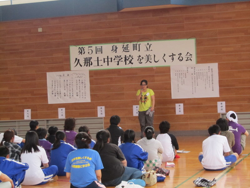 22日、身延町、久那土中の、トイレの掃除の終了後は、1班~12班までが、体育館に集まって、各班ごと代表者の発表です。発表している人は、駿河健康ランドの社員です。毎朝、20分間かけて「トイレの掃除」を、していますが、時間が少なすぎる為、これからは、最低1時間は、掃除の時間を取りたいと、発表していました。今日、三森社長は、ご夫妻で「トイレの掃除」に、参加して下さったそうです。感心しました。さすがですね。5月22日 撮影 東條初恵