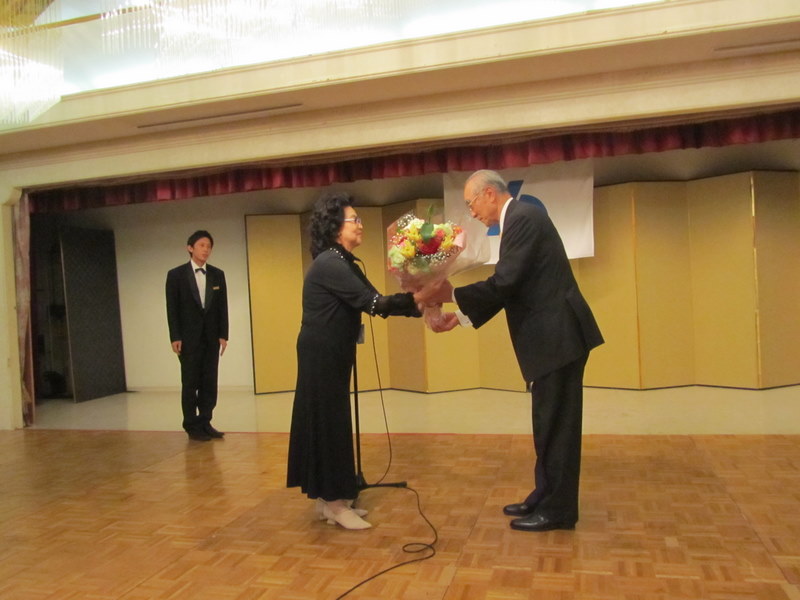 23日、午後3時から、アピオ甲府で開催された、第一回定期総会の席で、今回、退任なさる、前櫻井洋会長に、女性部の飯島敏子会長から、長年の労に感謝して、花束を贈りました。5月23日 撮影 東條初恵