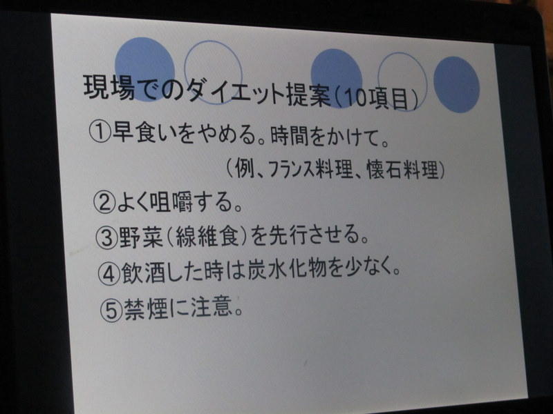 16日、夜6時より、やまなし女性異業種の会では、6月の定例会を、笛吹市の一宮温泉病院で、開催しました。斉藤義昭院長先生の、講話は、企業人として、現場でのダイエットについて、スライドを使って、お話をしていただきました。企業人は、忙しい人が多く、よく噛む習慣が無く、とかく早食いの人が多いため、肥満の人が多いので、ゆっくり食べる習慣を、身につけてくださいと、お話してくださいました。6月16日 撮影 東條初恵
