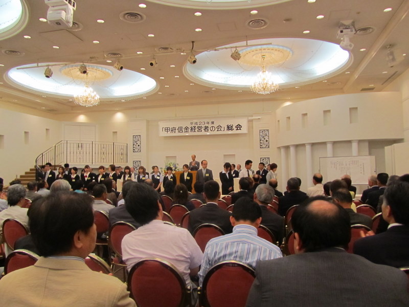 16日、甲府信金の、経営者の会で、会長の小澤誠様が、各企業から選ばれた、優秀社員に表彰式で賞状が渡されました。表彰式、終了後にバックして、「経営者の会の会員」の、皆さまの方を向いて、ご報告している写真です。6月17日 撮影 東條初恵