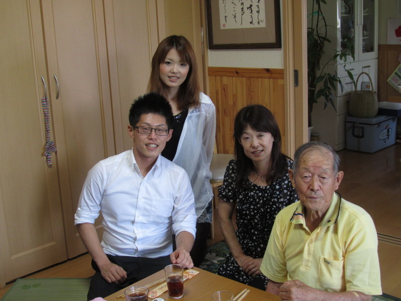 18日、お昼、つい先日、シンガポールの出張から、帰って来たばかりの、若い青年、ジットの社長の長男、石坂幸太郎君と、その家族です。お母さんの、お父さん(おじいちゃん)は、今年で85才ですが、携帯電話で、絵文字を入れてスイスイとメールを打っている事を聞き、ビックリしてしまいました。昨年までは、あけぼの大豆を沢山作っていたそうです。今年は、体調が悪く作れませんが、携帯電話の中には、昨年までの、トンネル栽培のナスや、カボチャ、「あけぼの大豆」等、栽培の写真がいっぱい入っていました。私の家にも、今日、あけぼの大豆と、ニンニクをお土産に持ってきてくれました。楽しい時間を過ごしました。幸太郎君は、明日、またシンガポールに飛び立っていきます。ご活躍を祈っています。