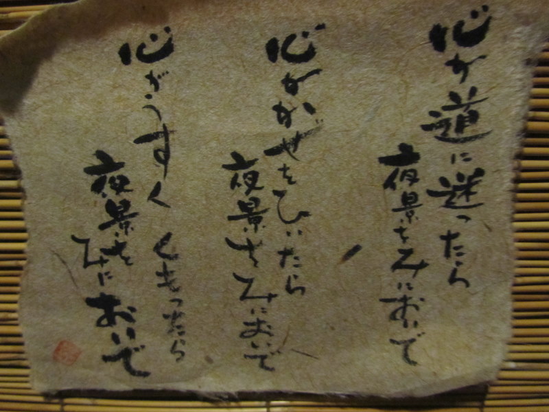 27日、夜7時、西八代郡三郷町大塚にある、夜景どころ、、酒どころの、、「一丁」に、仲間4人で行って来ました。とっても素晴らしい夜景でした。店内には、心が迷ったら、夜景を見においで、、心が風邪をひいたら、夜景を見においで、、心がうすく、雲ったら、夜景を見においで、、と、貼ってありました。さすがの夜景に感動しました。8月27日 撮影 東條初恵