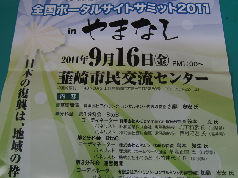 全国ポータルサミットin 2011が、9月16日〔金〕午後13時から、韮崎市民交流センターに於いて、開催されます。主催は、風林火山ビジネスネット運営委員会です。参加費5000円、全国から企業家が集まって、各、分科会に分かれて、活動発表を行います。当日参加できる人は、東條迄、連絡ください、私は、もちろん参加します。ご一緒に参加しませんか。8月26日 撮影 東條初恵、