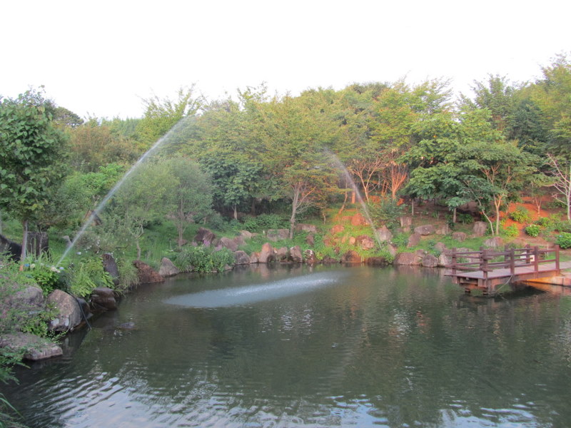 15日、北杜市明野の、「ハイジの村」の、中にある、虹を出す噴水です。出向いた時が夕方でしたので、太陽が当たっていませんから、虹がはっきり見えませんが、周囲の自然をご覧になってください。この池には沢山の鯉が泳いでいました。8月17日 撮影 東條初恵