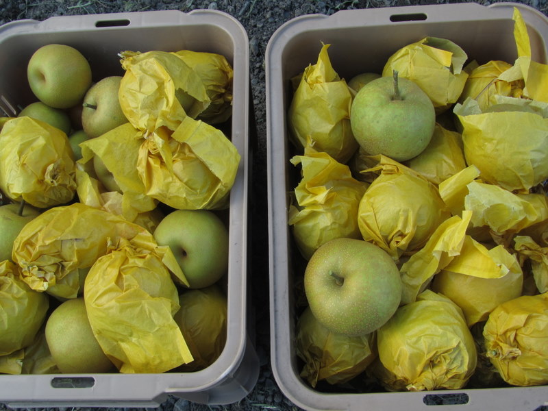 一つ一つが、きっとご自分のお子様のように大切なものにみえるのではないでしょうか。虫にもやられていない、本当にきれいで立派な梨ですね。