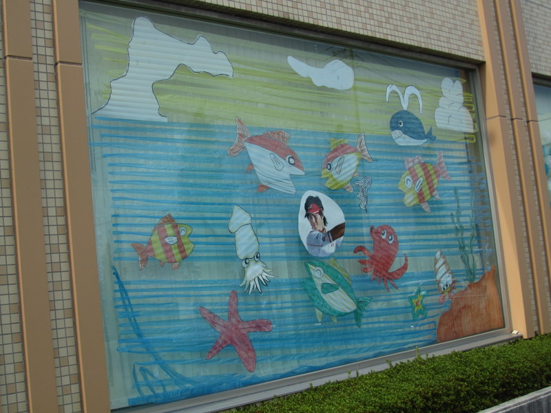 26日、甲府信金白根支店の、大きなウインドーガラスです、大きな入道雲が出ていて、海の中をクジラや、タコ、くらげ、鯛などが涼しそうに、泳いでいる様に見えますが、海の真ん中に、「ゴルフの石川 遼君」が、いることが不自然の様な気がしますね。チョツトおかしいよね、、、8月26日 撮影 東條初恵