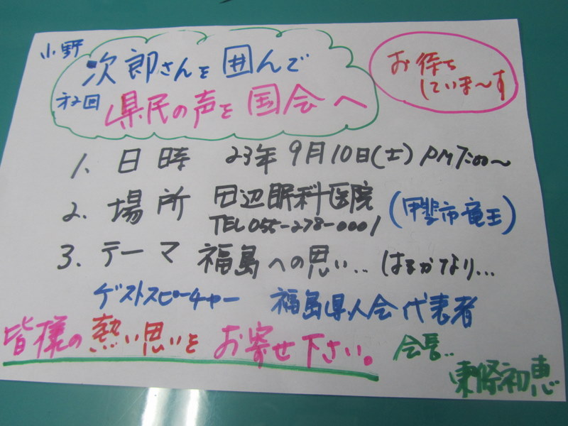 お知らせします、9月10日〔土曜日〕夜7時~9時まで、田辺眼科医院に於いて、第2回目、小野次郎〔参議院〕さんを囲んで、県民の、小さな声を国会へと題して、毎月、第二土曜日に、田辺眼科医院をお借りして、勉強会を行っています。今月の課題は県内に住む、福島県人会の代表者を招き、福島への熱い思いを、お聞きしたり、県内の皆さま方の、ご意見や考え方をお願いしたくて、9月の定例会を開催します。第一回目は50人ほど集まりました、時の最新の話題をお伝えしていきますので、多くの人の参加をお待ちしています。 会長、 東條初恵 9月5日 撮影 東條初恵