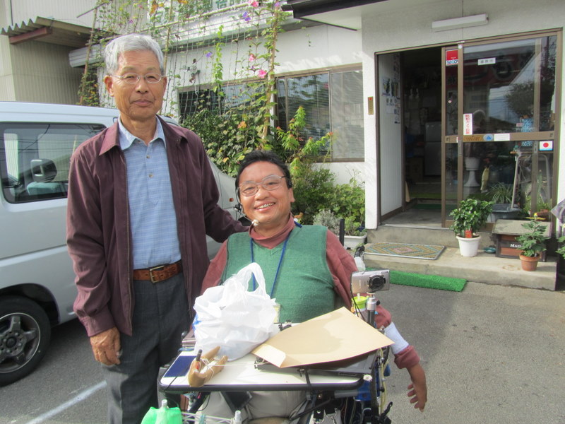 南アルプス市の障害者、支えあう会、「ピーチ&グレープ」代表、芦澤茂夫さんが、先ほど障害者をバス1台で、河口湖に行って、研修して来たからと、言ってシラネパックへお土産を届けに来てくださいました。ありがとうございます。今、南アルプス市で、車椅子で入れない段差のあるところは、市に要望して、ほとんど解決しているそうです、ご自分の、車椅子には、アイパットまで、ついていてビックリしました。ご立派ですよね。10月20日 撮影 東條初恵