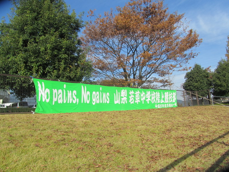 13日、午前9時15分より行われた、南アルプス市駅伝大会の会場(櫛形総合公園、陸上競技場)に、飾られていた、若草中学校の陸上部の応援旗です。最初見た時にすぐ訳す事が出来なかったので、東京にいる次女、東條亜紀子さん電話をしたら、すぐ教えてくれました、NO. pains.NO.gains「目標を達成するには、努力が必要」「苦労しなければ、勝利は無い」 日本のことわざで言うと、「蒔かぬ種は、生えず」と、教えてくれました。努力しないと、何も手に入らないと言う事でしょうね。勉強になりました。11月13日 撮影 東條初恵