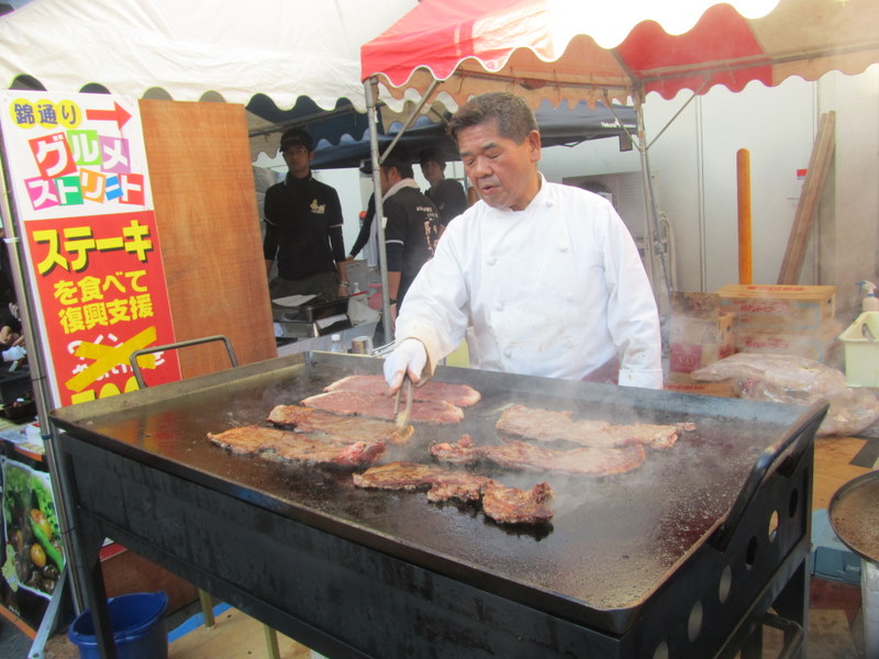 23日、甲府「えびす講」です。写真は、肉の連合組合の人達です。大きなジャンボステーキを、その場で焼いてくれています、一つ500円で、私はお肉を3つ買いました。「カボチャ、ほ゛うとう」の、直売のお手伝いが出来なかった為、みんなに差し入れして食べていただきました。以前、大変お世話になった、川杉部長も、お肉の組合にお手伝いに来ていました。11月24日 撮影 東條初恵