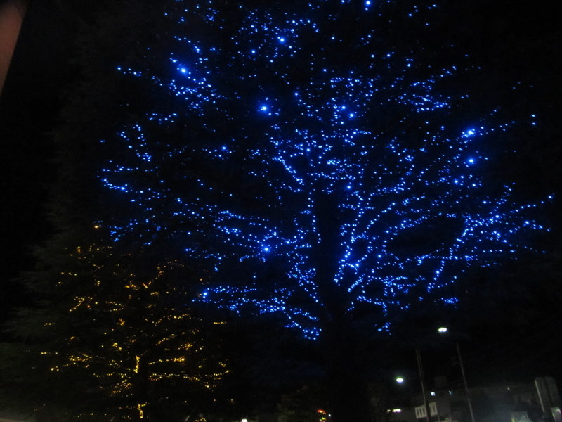 25日、夜9時です。室内管弦楽演奏会のコンサートが終了し、学園内にある「イルミネーション」です。去年も、この青い光を見ましたが、大学らしい、とてもさわやかなイメージがしました。11月26日 撮影 東條初恵