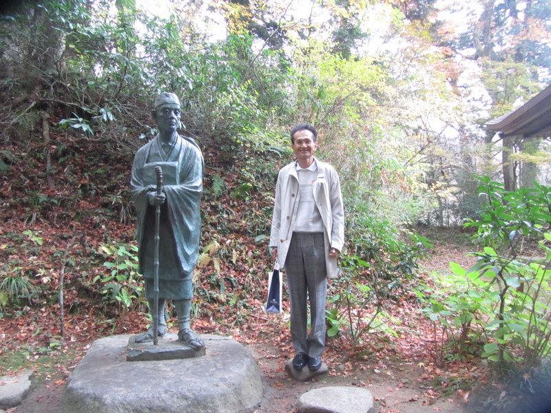 19日、午前、岩手県平泉にある「世界遺産中尊寺の金色堂」を、元禄2年(1689年)に「奥の細道」の旅に出た、松尾芭蕉は、金色堂を参拝し、「五月雨の 降り残してや 光堂」と、言う句を残したそうです。「芭蕉のかるた」が売っていましたので買って来ました。 松尾芭蕉に似ても似つかぬ人が、嬉しそうにニコニコしながら、記念撮影をシテイマス。11月20日 撮影 東條初恵