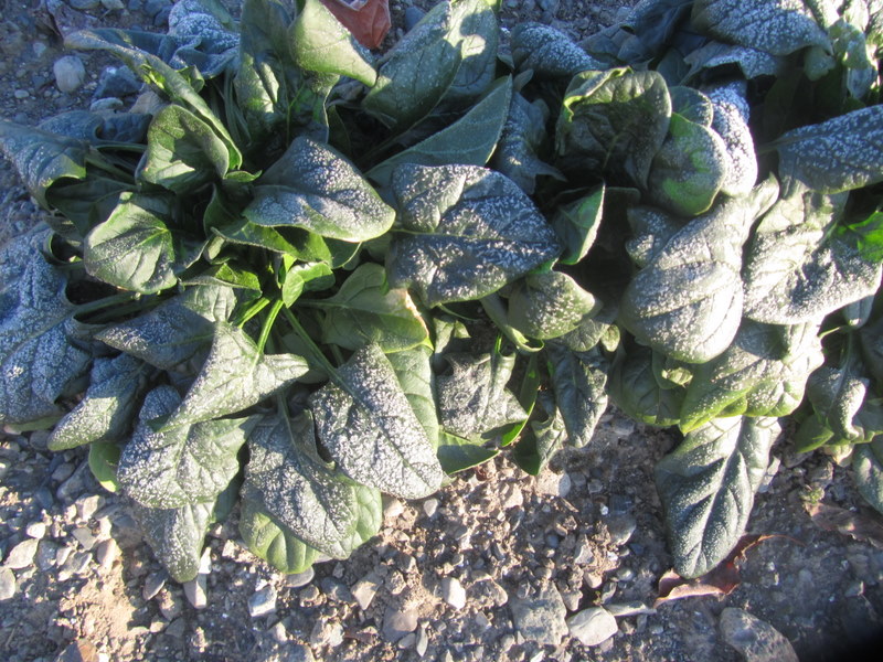霜で真っ白なのに日があたり乾いてくるといつものホウレンソウに戻ります。冬野菜は寒さに耐えて体にもいいでしょうね。12月21日seiko