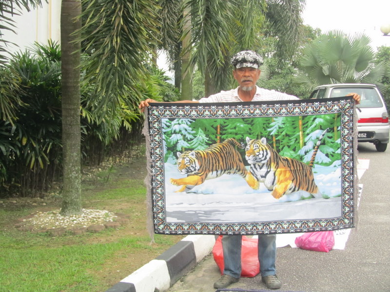 12日、マレーシアのアブバカール回教寺院の前で、露天商が、虎のジュータンを1枚1000円、1000円と言いながら道行く観光客に見せながら、売り込んでいる所です。マレーシアの現地ガイドが、絶対に買わない様にと、言っていましたので、虎のジュータンを見向く人もいなくて、可哀そうな感じがしました。12月14日撮影 東條初恵