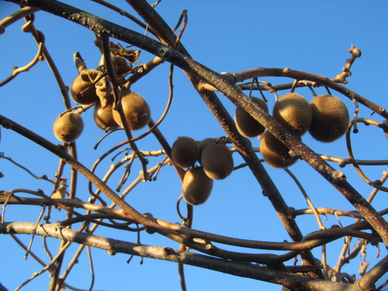 23日、早朝ウォーキングです。今朝も寒くマイナスでした。15分くらい歩き始めて少し体が温まって来ました、写真は、キューイフルーツです。小さい玉だから、農家の人が、もぎ採らずに木になったままにしてあります。もったいない様な気がしました。12月23日 撮影 東條初恵