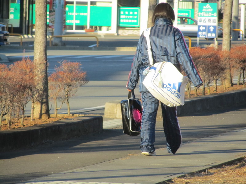 sports部でしょうね、そのシューズケースは!さっさと歩いて朝練に行くのかな?高校の時を思いだしました。、
