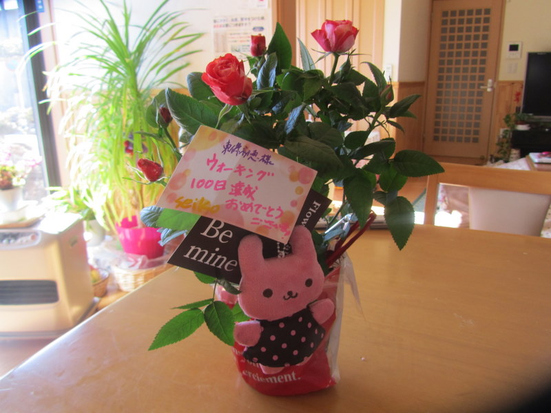 3日、午前10時、内藤誠子さんが、ウォーキング達成100日目の、お花を届けてくれました。100日目は、200日目 の通過点なのに、なんか、お金を使わせて申し訳なく思っています。奇麗なお花をありがとうございました。2月3日 撮影 東條初恵