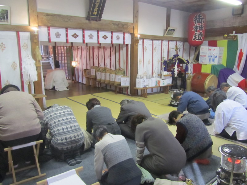 15日、南アルプス市にある豊諏訪神社へ、「2月、中の日」のお参りに行って来ました。竹埜正、宮司様が祝詞をあげて下さっていますので、参列者はみんな一緒に、祝詞に合わせて、姿勢を正してお辞儀をしてお祈りをいる所です。2月15日 撮影 東條初恵