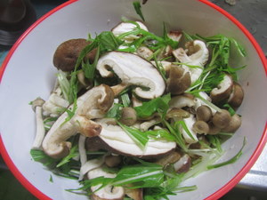 13日に、東京都高尾から、お水取りの帰りに、秋山温泉によって、買ってきた、採りたて新鮮なキノコを3種類を 、シリコン ボールに「シイタケ」と、「シメジ」と、「平茸」を、厚めに切ってボールに入れ、最後に「水菜」をのせて、レンジで、2分間チンをして出来上がりです。出来上がったキノコは、酸味の利いたドレッシングで召し上がってください、美味しさ抜群、体に優しく、いっぱい食べられます。「赤いシリコン ボールは」600円くらいで売っています。試してガッテンしてみてください、、2月15日 撮影 東條初恵