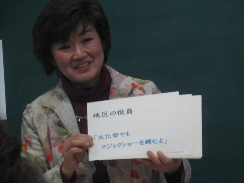 7日、午後1時より、甲府市酒折にある、奥脇洋子、コミュニケーション・研修に、ゲスト参加させていただきました。写真は生徒の上野さんが、御自分の体験を通して、発表している所です。上野さんは、子供の成長を通して、多くの人にお世話になって来たお話でした。1) 校長先生、2) 担任の先生、3) 塾の先生、4) 保健室の先生、5) カウンセリングの先生、6) マジックの先生、7) サイエンスショーの大学院生、8) ビーズアクセサリーの先生、9) ガソリンスタンドの店主、10) 床屋さん、11) 近所のおばちゃん、12) 和菓子作り、13) トイレの先生、14) 2人のクラスメイトでした。こんなに多くの人達に支えられて、成長してきた過程をお話して下さいました、上野さんの素直な、細やかな、心に魅かれてしまいました。