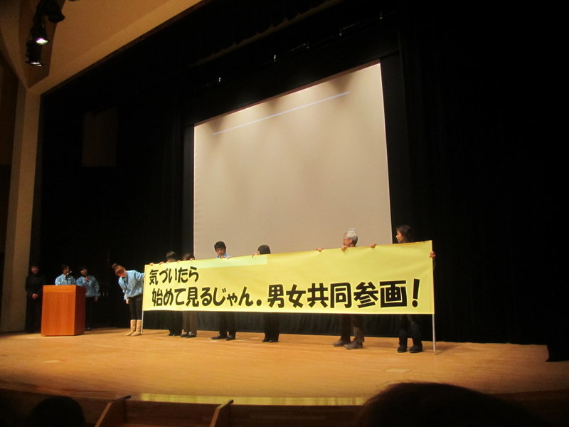 12日、午後1時から開催された、南アルプス市ハーモニーフォーラムの活動報告も、たくさんの発表を盛大に終了しました。最後にハーモニーフォーラムの推進委員の人達が、長い長い、横断幕を掲げ、~気づいたら、初めて見るじゃん、男女共同参画~男女が人権を尊重し、一人一人がともに輝き、生きがいのある、社会の実現を目指すための、活動を繰り返し、繰り返し進めていく宣言もありました。2月12日 撮影 東條初恵