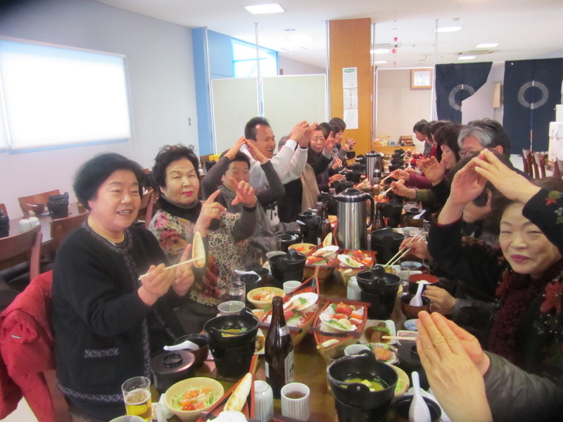 20日、宮城県の松島でお昼ご飯をいただいている所です。「笹かまぼこ」の、工場を見学してから、 「笹かまぼこ」の工場の二階で、お食事前に、みんなで、「笹かまぼこ」の、マネをしている写真です。みんなの手の先が、トンガッテいる姿をご覧ください、中には、不マジメの人もいますよ。よ~く、ご覧下さい、性格が出ています。左前の里吉さんは、箸で「笹かまぼこ」を持っています。2月25日 撮影 東條初恵