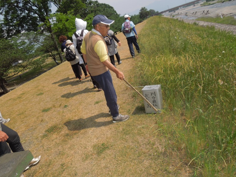 8日.午后2時.釜無川の土手を、ゴミを見つけながらの、ウオーキングに参加しました。主催はコマ共立病院でした。初めて参加しましたが、年配者の元気には、驚いてしまいました。写真は、川魚を、追い払う為の、缶を、叩いている様子です。片道1時間歩いても、平気でした。6月10日.撮影 東條初恵