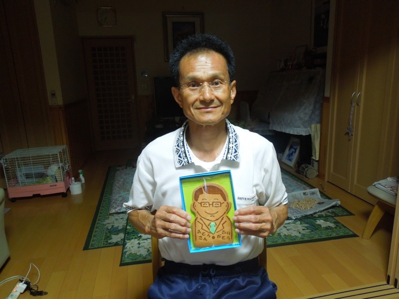 17日.父の日に、東京に住む、次女の、亜紀子さんから、クッキーのブレゼントを、いただき喜んでいる、東條一邦さんです。写真を撮るから、笑って、笑って、と、言ってもこれが最高の、笑だそうです。面白い顔、、。6月19日.撮影 東條初恵