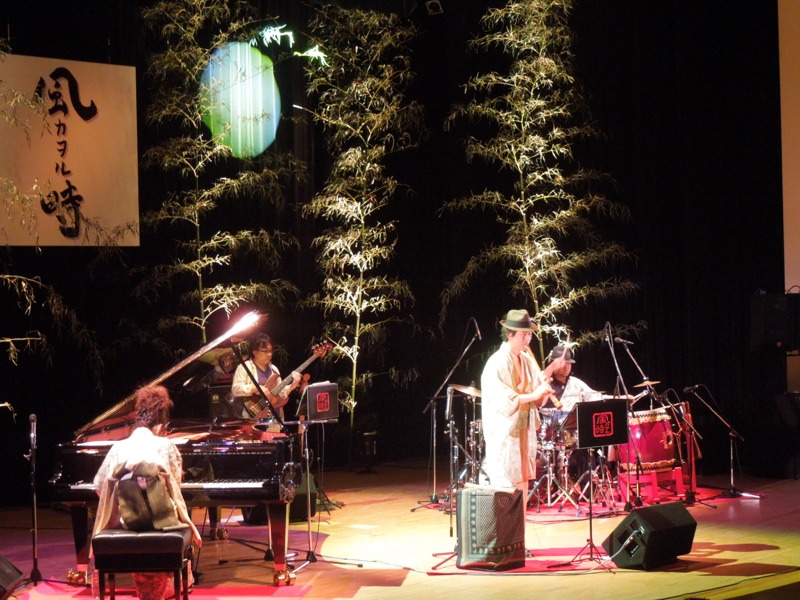 7日.午後4時より南アルプス市、アヤメホールに於いて、七夕にあわせて、純和風ジヤズユニット「風カヲル時」の、メンバー四人が、七夕の「織姫と彦星」のために、今日だけでも一緒にジャズに酔いしれる様な、企画を立てて、会場には笹の葉や、竹の木が、いっぱい並びました。その中で、ビアノと、尺八と、ドラムと、ギター演奏をしてくれました、尺八は主人といとこの岩間さんでした。7月7日.撮影 東條初恵