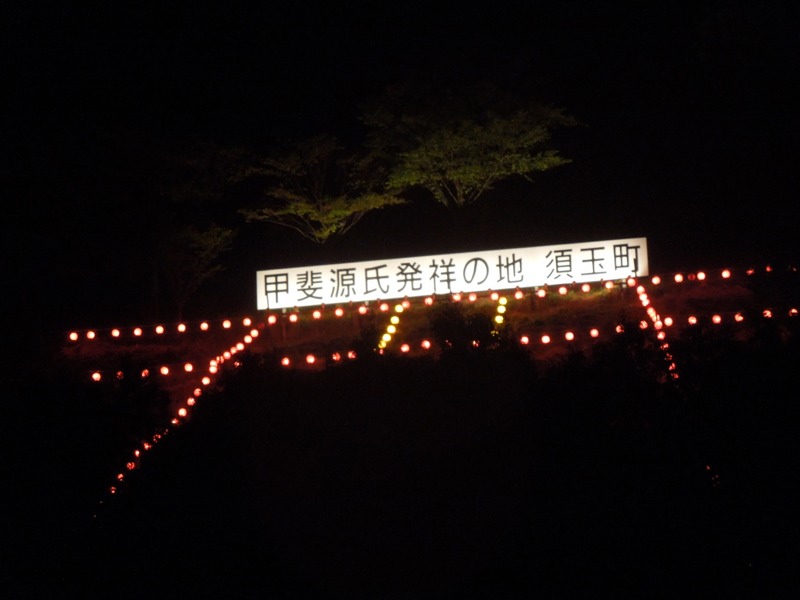 17日、清里の「弘法水の湧き水を」お水取りに行った帰りに、車で須玉町を通過したら、山の高いところに、赤々と灯りが、ともっていましたので、車を止めて写真を撮りました、「甲斐源氏発祥の地、」須玉町と書かれていました。ご覧になって下さい。8月20日.撮影 東條初恵