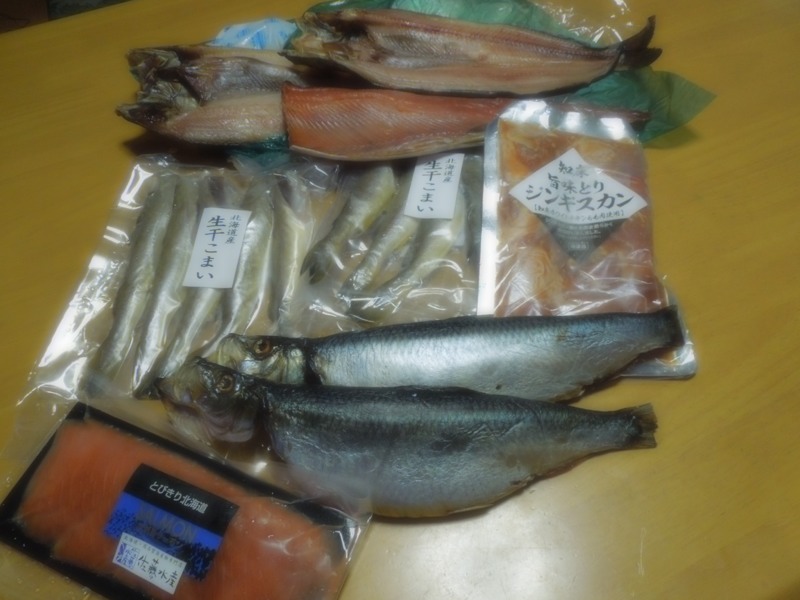 6日、北海道へ仕事で出掛けた、akiko,Tojoさんから'こんなに沢山、「北海道の幸」が、ドッサリとお土産で届きました。当分お魚は買わなくても良さそうです。「ニシン、ビックなホッケ、サーモン、ジンギスカン、氷下魚、シャケの半身、」中でも私の大好きな、氷下魚が2袋も入っていました。やまなし女性異業種の会の、役員会から帰って来てから、氷下魚を、焼いていただきました。幸せ感に浸っております。ありがとう、、9月6日.撮影 東條初恵