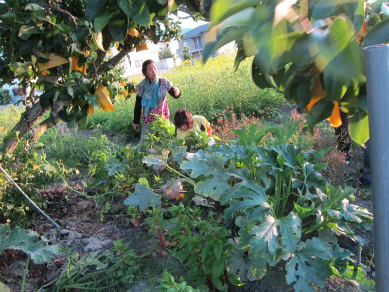 18日.午後6時より、やまなし異業種の会では、7月の定例会を、中央市に住む、内藤初三様の、なっちゃんの楽園を視察しました。写真の木に、袋がかかっているのは、梨の実です。まもなく盆前には収穫ができるそうです。右手前の、大きな葉っぱは、ズッキーニの木です。内藤はつみさんが、説明してくれていますが、後方に見える「黄色い花」は、お盆に飾る.女郎花(オミナエシ)です。副会長の宮沢由佳さんと一緒に、カボチャでも収穫しているのでしょうか。ご覧になってください。7月18日.撮影 東條初恵